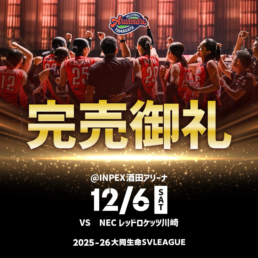 12月6日(土)に開催する2025-26大同生命SV.LEAGUE WOMEN 第9節 アランマーレ山形 vs NECレッドロケッツ川崎の観戦チケットは、販売予定枚数をすべて販売を終了し完売となりました。