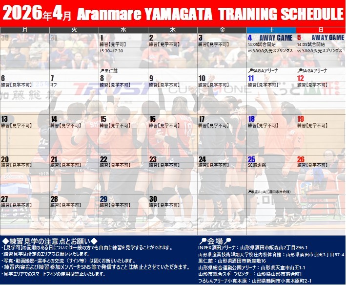 2026年3月29日 / 最終更新日 : 2026年3月29日 admin 練習スケジュール 2026年4月の練習スケジュールについて いつもアランマーレ山形に温かいご声援をいただきまして、誠にありがとうございます。 26年4月の練習スケジュールをお知らせいたします。 なお、今後も練習スケジュールが急遽変更になる場合がございますので、最新情報はチーム公式Xでご確認ください。