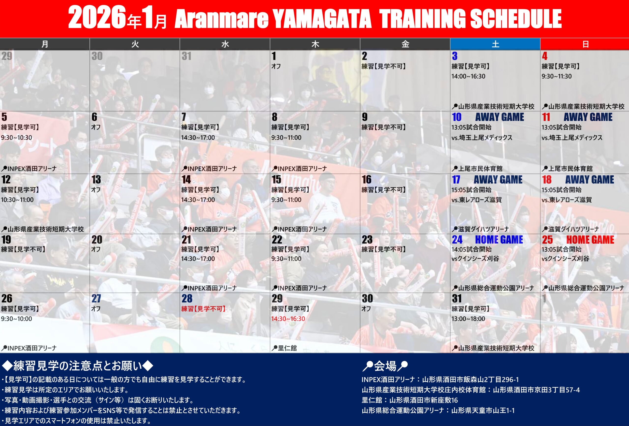 1/28(水)練習【見学可】 14:30 ~ 17:00 INPEX酒田アリーナ ➡ 見学不可